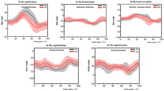 The joint angles at BE as well as FE between NL1 and NL2 of the hip, knee, and ankle were statistically analyzed, with the results shown in Table 3. In the sagittal plane, compared with NL2, NL1 had a significantly greater hip flexion (p = 0.001) and knee flexion (p = 0.007) at BE. Moreover, NL1 had a significantly greater hip extension (p < 0.001), knee flexion (p < 0.001), and ankle flexion (p = 0.008) at FE. In the frontal plane, the hip adduction and abduction in NL1 were all less than NL2. In the transverse plane, the hip internal and external rotations of NL1 were greater than NL2.