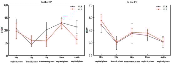 The ROM of NL1 and NL2 during the BP and FP are shown in Table 5. The lower limb ROM values for NL1 and NL2 were significantly different in the BP and FP. In the sagittal plane, NL1 displayed less hip extension (p = 0.042) and knee extension (p = 0.042) at FP and less ankle flexion (p = 0.015) at BP. In the frontal plane, NL1 displayed significantly greater hip adduction (p = 0.003) at BP. In the transverse plane, NL1 displayed significantly less hip internal rotation at BP.