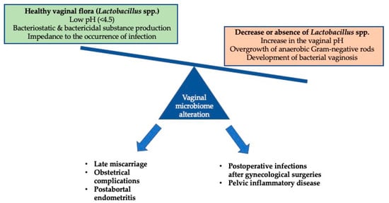 Furthermore, BV can lead to the development of several commonly seen infections, such as chorioamnionitis, postpartum and postabortal endomyometritis, preterm delivery, postpartum fever, and postabortal PID [5,7]. Moreover, BV can increase the risk of the transmission of sexually transmitted infections [8,9,10,11]. BV may cause endocervical inflammation presenting as mucopurulent cervicitis and has been associated with a three-fold higher risk of vaginal cuff cellulitis and abscess development or pelvic infection after vaginal hysterectomy [24,25,26,27]. Additionally, a four-fold higher chance for the development of post-operative pelvic infection in premenopausal women with BV undergoing abdominal hysterectomy was noted [115]. Additionally, women with BV undergoing major gynecological surgery were also more likely to develop post-operative fever and infections [116]. Importantly, BV is also associated with adverse outcomes among full-term infants, as a link between BV in the mother and an increased risk of respiratory distress and assisted ventilation, admission to the NICU, and neonatal sepsis among infants who were full-term has been documented. BV may also increase the risk of postabortal PID [29], while in women with BV, a higher rate of late miscarriage (13–23 weeks’ gestation) has been demonstrated.
