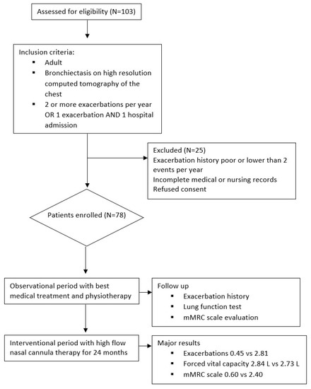 The major burden of bronchiectasis is related to exacerbations, loss of working days, and hospitalizations. Those outcomes require an adequate amount of time to be assessed with reliability. For this reason, in our study, we selected patients with documented bronchiectasis and also affected by a severe clinical status and set the follow-up at 24 months from HFNC initiation.