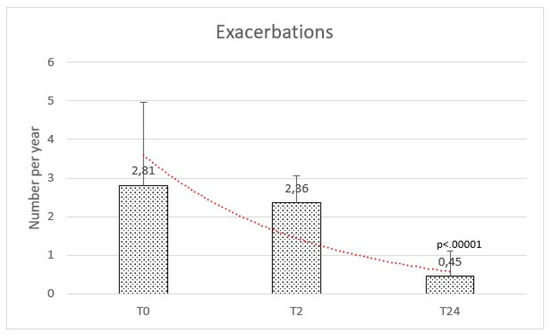 Exacerbations were comparable at baseline (T0) and after 2 months (T2), while reduced after the high flow therapy at 2 years (T24).