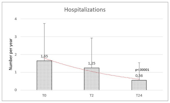 Hospitalizations were comparable at baseline (T0) and after 2 months (T2), while reduced after the high flow therapy at 2 years (T24).