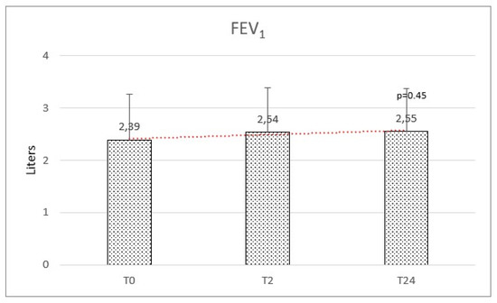 Forced expiratory volume in the first second (FEV1) at baseline (T0), after 2 months (T2), and after 2 years (T24) was not significantly modified.