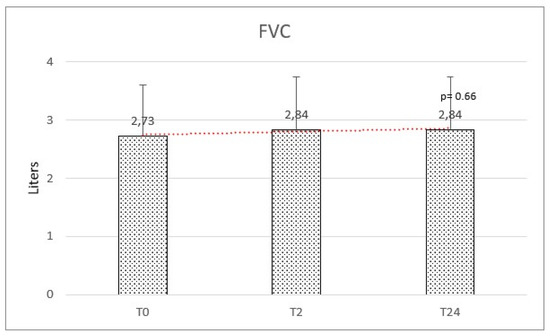 Forced vital capacity (FVC) at baseline (T0), after 2 months (T2), and after 2 years (T24) was not significantly modified.
