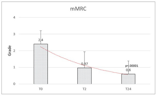 Modified Medical Research Council (mMRC) scale significantly improved from baseline (T0) to follow-up after 2 months (T2) and after 2 years (T24).