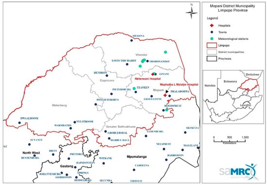 Location of the two hospitals and several meteorological stations in Mopani, Limpopo province, South Africa.