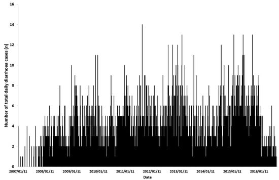 Total daily number of hospital admissions counts for diarrhoea for the study period 2007 to 2016.