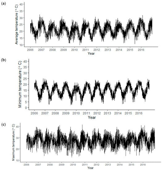 Trends in (a) average, (b) minimum and (c) maximum temperature (°C) for 2007 to 2016.
