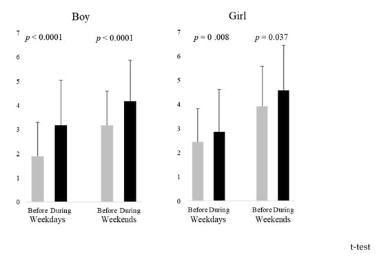 The results of the leisure screen time comparison are shown in Figure 1. Both boys and girls experienced significantly more leisure screen time during the pandemic than before the pandemic, according to the results of the t-test. Leisure screen time on weekends was particularly long, with 4.2 h (SD = 1.7) for boys and 4.6 h (SD = 1.9) for girls.