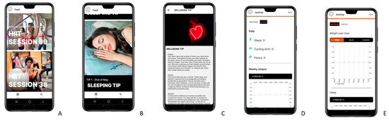 - Activity tracker: participants will be able to check their activity at any time of the day through the Xiao Mi Band 5 smartwatch (Figure 2D). The data will also be displayed in the app with weekly charts so participants can see their progression. The participants will also be able to track their weight and their sleep over time (Figure 2E) through the application. Moreover, their heart rate will be recorded. This tool aims to give feedback on behavior and promote self-monitoring of physical activity.