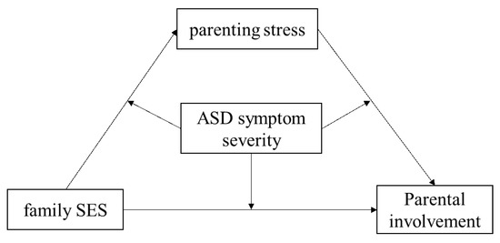 According to Belsky’s (1984) process model of parenting [15], parenting behaviors are shaped by family contextual sources, parental psychological traits, and children’s characteristics. In addition to family SES, two other influencing factors of parental involvement, namely, parenting stress and ASD symptom severity, have received extensive attention from researchers [5,8]. According to Eccles and Harold’s (1996) parental involvement model [16], the association between family SES and parental involvement reflects the processes in which the distal contextual factors affect parental involvement via the proximal factors internal to them. Therefore, family SES, as a family contextual source, may influence parental involvement through parenting stress and children’s ASD symptom severity. However, to date, little is known about the relationship between family SES and parental involvement and the potential role of parenting stress and ASD symptom severity in the Chinese context. We set out to examine this matter in this study.