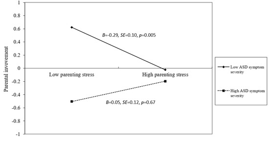Subsequently, a data plot based on the guidelines developed by Aiken and West (1991) [68] visually presented the interaction effect of parenting stress and ASD symptom severity on parental involvement (Figure 2). Figure 2 shows the predicted values derived from the simple slope test. It demonstrated parents’ involvement at high (one SD above the mean) and low (one SD below the mean) parenting stress levels with high/low levels of ASD symptom severity. The results indicated that at low levels of ASD symptom severity, parents with lower parenting stress demonstrate more parental involvement after controlling for children’s grades, ages, and family SES (B = −0.29, SE = 0.10, p < 0.01). In contrast, when ASD symptom severity reaches a high level, parenting stress does not affect parental involvement after controlling for children’s grades, ages, and family SES (B = 0.05, SE = 0.12, p > 0.05).