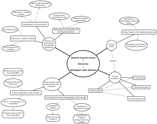 Figure 1 illustrates how the discourses of older Norwegian patients and Spanish migrant nurses shape the perceived reality in the context of situations of active listening, shared decision-making and participation in care. On the other hand, it also visually shows the interaction between the migratory experience of the Spanish nurses and the acquisition of cultural competencies regarding the exercise of their nursing profession.