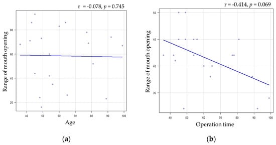 Relationship between range of mouth opening and related factors: (a) relationship between range of mouth opening and age and (b) relationship between range of mouth opening and operation time.