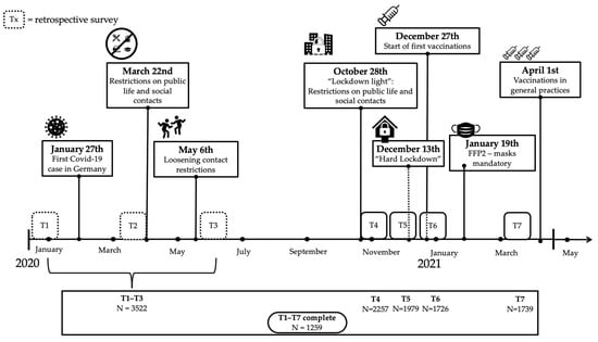 Timeline of phase 1 of the CovSocial project. The seven measurement occasions (T1–T7) are presented in the context of various COVID-19 pandemic-related developments in Germany in 2020 and 2021. Sample size at each assessment is also provided.