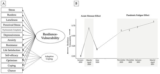 Panel (A) presents the latent factor model with the various indicators of resilience–vulnerability that entered the model. It also shows the additional adaptive coping factor that was modeled at each of the seven timepoints, which captured residual variances of the resilience indicators. However, this additional factor is not used for further analyses in this paper due to the low factor score reliabilities for this factor at all seven timepoints and also due to the focus of the current paper on more classic resilience–vulnerability aspects. Panel (B) presents the resilience–vulnerability growth trajectory across the seven timepoints, with acute lockdown and pandemic fatigue effects being observed during two lockdowns. Grey panels indicate the two lockdown periods in Germany.