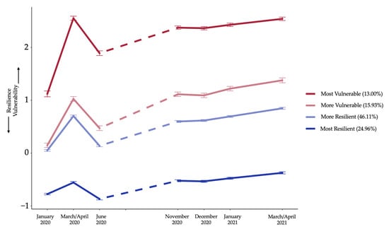The observed resilience–vulnerability time courses of the four classes. Using a growth mixture analysis, final class counts and proportions for the latent classes based on their most likely latent class membership were as follows: “Most Vulnerable” class 1 = 450, “More Vulnerable” class 2 = 587, “More Resilient” class 3 = 1622, “Most Resilient” class 4 = 863.