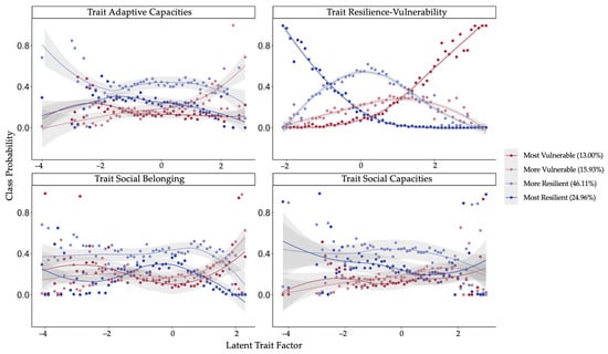 Probability of individual membership in a certain class as a function of the level of the latent trait predictors. The latent trait predictors used in the multinomial regression model were trait resilience-vulnerability, adaptive trait capacities, trait social belonging, and trait social capacities. The dots represent the predicted probabilities, and the lines depict the smoothed curves.
