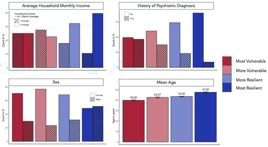 Of the demographic predictors, the female sex robustly predicted membership to all three classes, such that there were greater odds of individuals with the female sex being in the most vulnerable class, followed by more vulnerable and then more resilient classes. Age also significantly predicted class membership, such that we observed greater odds of younger people being in the most vulnerable class, followed by the more resilient class, compared to the most resilient class. Furthermore, there were greater odds of individuals with lower-than-average levels of income being in more vulnerable and more resilient classes as compared to the most resilient class. Lastly, we also observed greater odds of individuals with a lifetime prevalence of psychiatric disorders being in a more vulnerable class compared to the most resilient. Meanwhile, civil status, employment status, years of education, and migration background were not significant predictors for class assignment. For an overview of the demographic characterization of the four classes, see Figure 5.