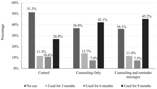 Almost 36.8% of women in the counseling-only group, 36.1% of women in the counseling and messages group, and 51.3% of women in the control group opted not to use MFPMs. Overall, 26.8% of women in the control group, 42.1% of women in the counseling-only group, and 45.2% of women in the counseling and messages group used MFPMs continuously for all 9 months (Figure 2).