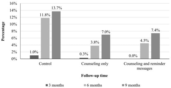 Figure 3 presents the pregnancy rate among women in the three study groups at different follow-up times. At 3 months after the initial visit to the health center, 1% and 0.3% of women in the control group and in the counseling group, respectively, were pregnant. None of the women in the counseling and message group were pregnant at 3 months. At 6 months, 11.8% of women in the control group, 3.8% of women in the counseling group, and 4.5% of women in the counseling and message group were pregnant. At 9 months, the pregnancy rate was significantly much higher in the control group (13.7%) compared to women in the counseling group (7.0%) and women in the counseling and message group (7.4%).