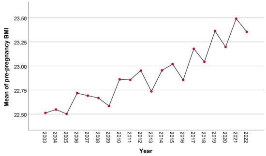 Among 37,027 women who gave birth during the study period of 20 years, the mean maternal age increased from 27.7 ± 5.9 years in 2003 to 30.8 ± 5.4 years in 2022 (p-value < 0.001), as presented in Figure 1. In addition, the mean pre-pregnancy BMI increased from 22.5 ± 5.4 kg/m2 in 2003 to 23.4 ± 5.7 kg/m2 in 2022 (p-value < 0.001), as presented in Figure 2. The mean ± SD gestational age at first visit was comparable in women with GDM, PDM and controls (14.2 ± 4.2; 16.1 ± 5.4; and 15.3 ± 4.8 weeks; respectively). The mean ± SD gestational age at OGTT was 22.4 ± 8.1 week. Of the women, the prevalence of DM in pregnancy was 11.4% (4223 cases), including 214 cases of PDM (0.6%) and 4009 cases of GDM (10.8%). Trend tests showed that the average annual percentage changes are different from zero, p-value <0.001, <0.001 and <0.001 for overall DM, PDM and GDM, respectively. The prevalence of PDM significantly increased from 0.3% in 2003 to 1.5% in 2022 (p-value < 0.001), as presented in Figure 3; the prevalence of GDM also significantly increased, dramatically, from 3.4% in 2003 to 22.0% in 2022 (p-value < 0.001), as presented in Figure 4.