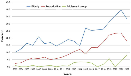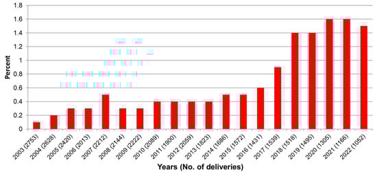 On analysis of the maternal age subgroups, the increase in the prevalence of DM in pregnancy over time, from 2003 to 2022, was evident in all of the three age groups. The greatest increase in the prevalence of PDM (from 0.2% in 2003 to 2.5%; p-value < 0.001) and GDM (from 10.1% in 2003 to 33.5%; p-value < 0.001) was demonstrated in the elderly group, as presented in Figure 5 and Table 1. In the adolescent group, the increase in the prevalence of GDM was statistically significant (from 0.4% in 2003 to 8.0%; p-value < 0.001), whereas the average prevalence of PDM in the adolescent group was only 0.2% and no significant change occurred over time (p-value 0.968). Additionally, the prevalence of PDM and GDM increased significantly with pre-pregnancy BMI. The prevalence of PDM among women with obesity was two times that of women with normal BMI (p-value < 0.001). Of note, the prevalence of GDM among women with obesity was 14.4%, as presented in Table 1.