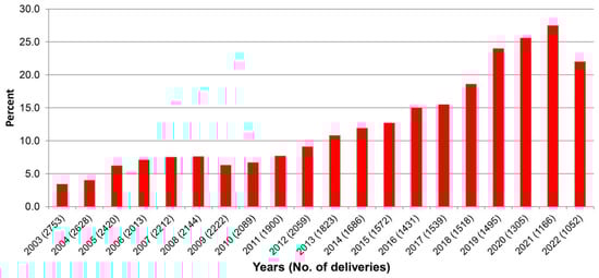 This is a retrospective analytical study using the obstetric database of the maternal–fetal medicine (MFM) unit, department of Obstetrics and Gynecology, Chiang Mai University, Thailand. The study was conducted on pregnant women who gave birth in a single center, Maharaj Nakorn Chiang Mai Hospital, a tertiary hospital and medical teaching school. The study was ethically approved by the institutional review board (The Research Ethics Committee 4; Faculty of Medicine, Chiang Mai University; Study Code: OBG-2565-09130/Research ID: 9130). Our digital obstetric database was first developed by the MFM team in 1990, including baseline characteristics, obstetric and clinical data, as well as pregnancy outcomes, specifically designed and recorded to base obstetric research works and annual reports. However, this study included pregnant women who gave birth from January 2003 to December 2022, during which the policy of GDM screening and diagnosis was well-established with high homogeneity of management. The database was accessed to retrieve all consecutive cases of pregnancies during the study period. The patients were mainly categorized into two groups: pregnant women diagnosed with diabetes mellitus (DM) as the study group and non-DM pregnancies as the control group. The patients in the study group were further categorized into two subgroups: pre-gestational diabetes mellitus (PGM) and gestational diabetes mellitus (GDM). GDM was defined as a condition in which carbohydrate intolerance first occurred or was first detected during pregnancy. During the past two decades, we used the same protocol of screening and diagnosis. Our policy was risk-based screening [3], not universal screening. Pregnancies at high risk of GDM were screened at the first visit to our antenatal care clinic for detecting pre-gestational DM (PGM). The cases of negative screening test were screened again at 24–28 weeks of gestation. Pregnancies at average risk were screened at 24–28 weeks of gestation. The criteria for high risk used in our practice include obesity (BMI > 25), strong family history of type 2 DM (known diabetes in the first degree relatives), previous history of GDM, impaired glucose metabolism, or glucosuria [3], while those for average risk include known history of DM in first-degree relatives, age of greater than 30 years, overweight (BMI of 23–25 kg/m2), hypertension or history of cardiovascular disease, history of large-for-date fetuses in a previous pregnancy, and history of unexplained poor obstetric outcomes. The screening method followed the two-step approach, which was based on first screening with the administration of a 50 g oral glucose solution followed by a 1 h glucose determination. Pregnant women whose glucose levels exceeded 140 mg/dL were considered to have a positive screening test and underwent a 100 g, 3 h diagnostic OGTT [3]. GDM was diagnosed in the women who had two or more abnormal values on the 3 h OGTT. Pre-gestational diabetes mellitus (PDM) was defined as DM of any types detected in women prior to the onset of pregnancy.