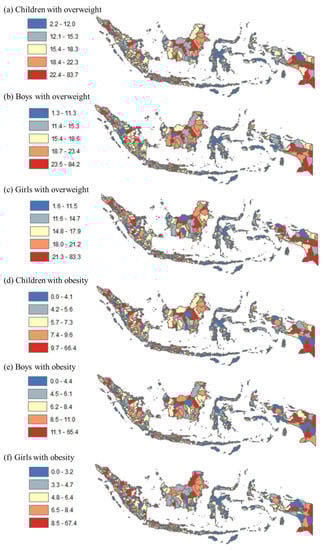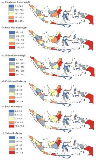 In Figure 1, the prevalence of childhood overweight and obesity is shown by quintile at the province level. Panels a–c show the range of overweight prevalence among all children, boys, and girls, which varied from 5.5% to 27.5%, 5.7% to 28.3%, and 5.3% to 26.7%, respectively. Panels d–f show the range of obesity prevalence among all children, boys, and girls, which varied from 1.8% to 12.4%, 2.1% to 13.8%, and 1.6% to 11.1%, respectively. High overweight prevalence among all children was found in many provinces in Java and Bali, Sumatera, Kalimantan, and some provinces in other regions (e.g., Sulawesi and Papua). Similarly, the highest obesity prevalence among all children was in many provinces in Java, Sumatera, Kalimantan, and two provinces in other regions. The pattern for both childhood overweight and obesity was relatively similar by sex.