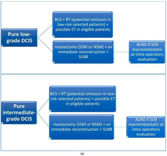 (a) DCIS and DCIS-Mi possible treatment options. DCIS—ductal carcinoma in situ; DCIS-Mi—microinvasive DCIS; BCS—breast-conserving surgery; ET—endocrine therapy; SLNB—sentinel lymph node biopsy; ALND—axillary lymph node dissection; SLN—sentinel lymph-node; RT—radiotherapy; CT—chemotherapy; SSM – skin sparing mastectomy; NSM – nipple sparing mastectomy. (b) DCIS and DCIS-Mi possible treatment options. DCIS—ductal carcinoma in situ; DCIS-Mi—microinvasive DCIS; BCS—breast-conserving surgery; ET—endocrine therapy; SLNB—sentinel lymph node biopsy; ALND—axillary lymph node dissection; SLN—sentinel lymph-node; RT—radiotherapy; CT—chemotherapy; SSM—skin sparing mastectomy; NSM—nipple sparing mastectomy.