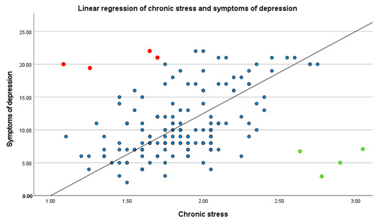 Example of a linear regression between chronic stress and symptoms of depression. Blue points illustrate the cloud of points of linear regression, some of these points were colored for a better understanding of the score: Green dots represent high resilient functioning individuals, and red dots represent low resilient functioning individuals.