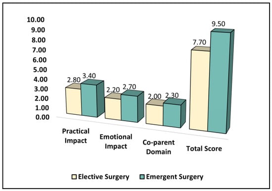 Parents in the emergent surgery group reported a significantly higher level of practical impact (median = 3.4, interquartile range (IQR) = 1.4–3.9) compared to the elective surgery group (median = 2.8, IQR = 1.6–3.3) (p < 0.001). Similarly, the emotional impact scores were significantly higher in the emergent surgery group (median = 2.7, IQR = 1.6–3.6) compared to the elective surgery group (median = 2.2, IQR = 1.1–3.0) (p = 0.002). There was no significant difference between the groups in terms of the co-parent domain, with a median score of 2.0 (IQR = 1.3–2.9) in the elective surgery group and 2.3 (IQR = 1.4–3.0) in the emergent surgery group (p = 0.266).