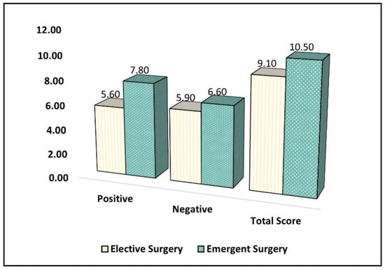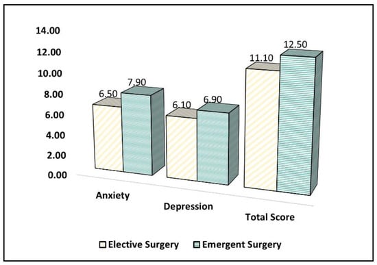 The total HADS score, which represents the overall level of anxiety and depression, showed no significant difference between the groups, with a mean score of 11.1 (SD = 5.8) in the elective surgery group and 12.5 (SD = 5.2) in the emergent surgery group (p = 0.101), as presented in Figure 2. Although the total score did not show a significant difference, the increased anxiety scores indicate that parents whose children underwent emergent surgery during the COVID-19 pandemic experienced higher levels of anxiety compared to those whose children underwent elective surgery.