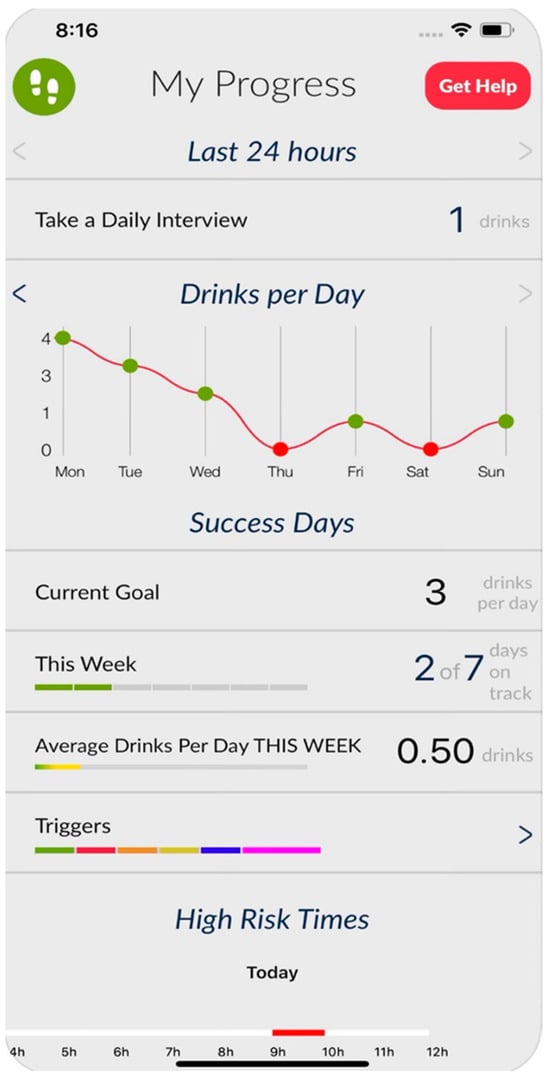 - Malte, C.A.; Dulin, P.L.; Baer, J.S.; Fortney, J.C.; Danner, A.N.; Lott, A.M.K.; Hawkins, E.J. Usability and acceptability of a mobile app for the self-management of alcohol misuse among veterans (Step Away): Pilot cohort study. JMIR mHealth uHealth 2021, 9, e25927. [Google Scholar] [CrossRef]