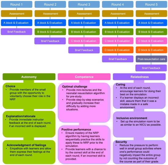 Rapid Cycle Deliberate Practice (RCDP), however, was developed for emergency clinical training at Johns Hopkins University; this mastery learning method uses within-event debriefing. RCDP utilizes a training method that pauses the simulation when a learner’s error is discovered during the scenario and immediately provides directive and personalized evidence-based feedback (solution-oriented debriefing, directing appropriate methods and techniques) for each step; thereafter, the simulation restarts the scenario from the beginning, and the problem situation is progressively expanded [,]. RCDP is repetitive training, and, therefore, offers a continuous improvement process, as well as the advantage of enabling the trainee to correct mistakes and promoting muscle and long-term memory through continuous practice []. RCDP has been associated with improved team performance, as it encourages trainees to take action as quickly and accurately as possible, which saves lives and prevents negative after-effects []. The use of the RCDP in-event feedback in resuscitation training helped achieve the goal of mastery learning by familiarizing students with resuscitation guidelines and enhancing their skills and competency []. Furthermore, Blanchard et al. [] found RCDP to be suitable for training algorithmic, time-sensitive, team-based procedural interventions. Some studies provided RCDP neonatal resuscitation training to experts (physicians) and demonstrated significant effectiveness; however, these previous studies focused mainly on resuscitation techniques and skill evaluation, and it was difficult to find studies that included intervention strategies to improve the decision-making ability for each stage of resuscitation and evaluate their effectiveness [,,]. Moreover, previous studies comparing the effectiveness of NRP interventions using the RCDP in-event feedback with after-event debriefing were focused on physicians or inter-professional education involving physicians and registered nurses, and studies targeting beginners (nursing students) were difficult to find [,]. Furthermore, no previous studies have seemingly applied theoretical frameworks to RCDP training as an intervention strategy.