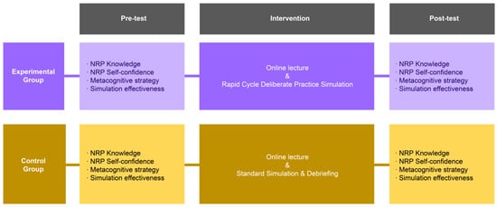 This study was conducted at J City University, with the permission of the head of the department, after explaining the nature and purpose of the study. The target population comprised senior nursing students from the university’s bachelor’s degree program. The selection criterion was that all participants had to be prelicensure nursing students; those who were absent during the semester, who had more than one year of experience studying or working before entering the nursing program, or who had previously participated in NRP simulation-related programs in addition to their coursework were excluded, as these conditions were deemed likely to affect the study results. The experimental or control group was assigned by convenience sampling. Three to four participants from the same group were assigned to participate in each scenario as a team.