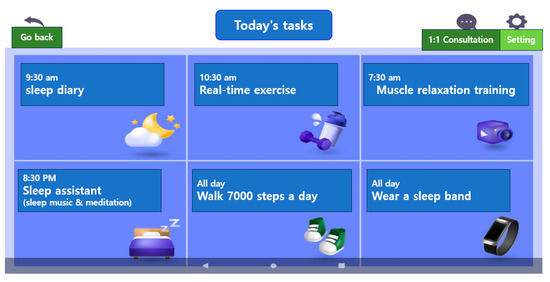 Sleep stimulation control and sleep restrictions were designed to keep the participants’ sleep-awareness schedule consistent, eliminate harmful behaviors in bed and bedroom, and limit the amount of time needed to fall asleep, creating effective and enhanced sleep patterns [38]. Stimulation control therapy aimed to create a consistent sleep–arousal pattern by changing the bed and bedroom environments to break the connection with sleep-disturbing behaviors and act as a conditioned stimulus linked to sleep-enhancing behavior [8]. For sleep restriction, the total bedtime was gradually reduced by 15 or 30 min weekly, referencing the user’s sleep diary, until 85% sleep efficiency was achieved, as per the Korean version of the clinical treatment guidelines for insomnia [39]. The sleep efficiency rate suitable for each individual was then computed based on the sleep diary, following the sleep efficiency calculation method outlined in the Korean version of the Clinical Treatment Guidelines. A program was developed to evaluate the participants’ daytime symptoms, such as fatigue, daytime sleepiness, and concentration, and to restrict sleep while checking whether the patients’ subjective symptoms were improving [39]. In this study, as part of sleep stimulation and sleep restrictions, the Smart Sleep application required participants to enter one week’s sleep habits every Sunday and check the state of the sleep habits to adhere to habits that stimulate sleep. In addition, the sleep habit questionnaire included necessary information for sleep hygiene, and the researcher checked the sleep habit questionnaire so that habits could be improved through real-time counseling.