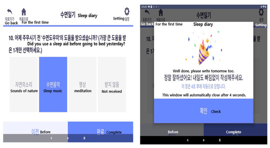 Sleep diaries are essential resources that provide useful evaluation information and guide the completion of CBT strategies [41]. Sleep activities and patterns were assessed using a sleep diary, and the appropriate sleep duration was fed back to the participants. It is an essential item in CBT-I and should be entered daily. Considering that the participants were older adults, the Smart Sleep application made it possible for sleep diary entries to be written in concise phrases, for easier understanding.