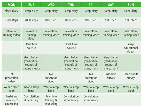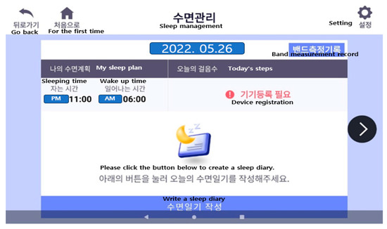 Sleep activity was recorded using sleep-specific wearable bands worn by the participants. The sleep activity record was automatically uploaded to the manager’s screen daily and managed accordingly. The ISI questionnaire was prepared once every Saturday and consisted of seven questions. Participants were tasked with completing a sleep-habit improvement questionnaire once every Sunday. Regular notifications were given, and push notifications were sent to the administrator when tasks were not completed so that the survey could be managed without missing data.