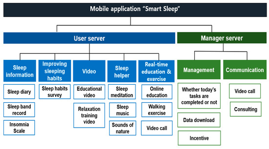 At the design stage, the structure and functions, including sleep information, sleep- habit improvement, sleep assistance, video, real-time counseling, and exercise services, were decided after receiving the preference analysis results and the advice from a panel of experts. In addition, to promote the execution ability of the application, a screen accessible to the administrator was added, and a configuration plan for feedback was included (Figure 4).