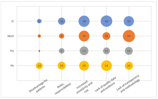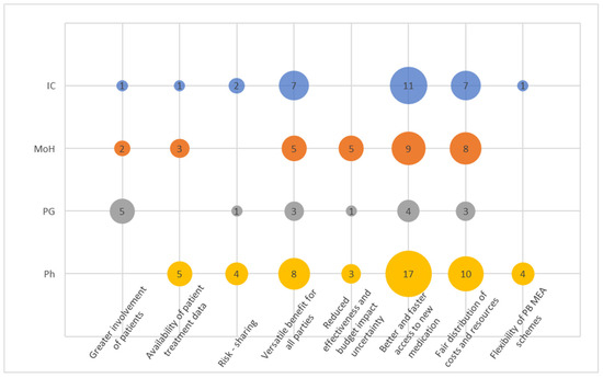 This cluster (Figure 2) had eight codes. There seemed to be a convergent opinion on at least three attributes of PB MEA among IC, MoH and Ph. Overall, pharma articulated their perceived pros on the PB MEA more frequently than any other stakeholder group (Figure 3), well demonstrated by the code “Better and faster access to new medication”. This code was also the most frequent among other codes mentioned by representatives of the MoH and ICs. Similarly, “Fair distribution of costs and resources” was the second most abundant among those three. A similar conclusion can be retrieved from the code “Versatile benefit for all parties”. The “Greater involvement of patients” was the most frequently mentioned code by PGs.