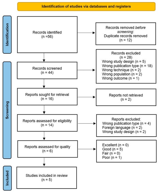 The initial database search yielded 56 records, which were reduced to 44 after eliminating duplicates. Following the title and abstract screening, 16 studies were considered for retrieval, with only 2 studies not being retrieved. A full-text review and quality assessment were conducted on 14 studies, and eventually, 5 studies were included in the final analysis. Figure 1 reports additional information and reasons for exclusion.