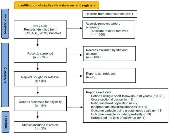 PRISMA 2020 flow diagram showing 33 cohort studies (with at least 10 years of follow-up) of early-life and middle-life risk factors of frailty.