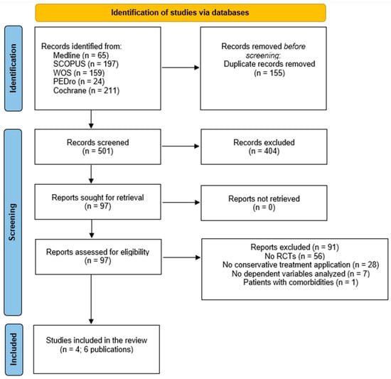 Initially, a total of 656 studies were obtained from all databases. After removing duplicates, the title and abstract were screened and a total of four studies [34,35,36,37] and two secondary analyses [38,39] (six publications) were included in the systematic review. One study was excluded due to the inclusion of patients with knee OA and other comorbidities [40]. The process of selection is illustrated in the PRISMA flowchart diagram (Figure 1).