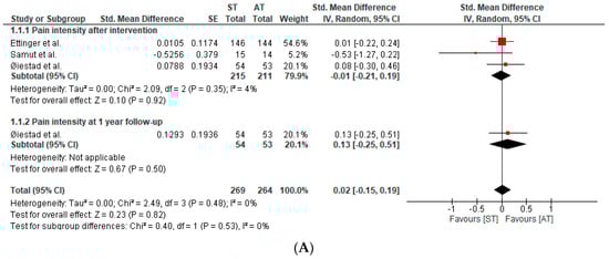 Four studies, in six publications, assessed pain intensity. The qualitative and quantitative synthesis of the results suggested no between-group differences in pain intensity in patients with knee OA (SMD after intervention: −0.01; 95%CI: −0.21, 0.19; I2: 4%; three studies; 426 patients; SMD at one-year follow-up: 0.13; 95%CI: −0.25, 0.51; I2: 0%; one study; 107 participants) (Figure 3A). The certainty of the evidence was downgraded to very low.