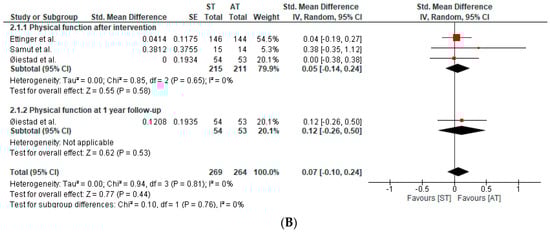 Four studies, in six publications, assessed physical function. The qualitative and quantitative synthesis of the results suggested no between-group differences in physical function in patients with knee OA (SMD after intervention: 0.05; 95%CI: −0.14, 0.24; I2: 0%; three studies; 426 patients; SMD at one-year follow-up: 0.12; 95%CI: −0.26, 0.50; I2: 0%; one study; 107 participants) (Figure 3B). The certainty of the evidence was downgraded to very low.