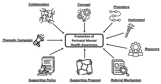 Promotion of perinatal mental health awareness in nine categories. Actions must be performed in the following categories to raise mental health awareness and promote it: (i) concept of mental health integration; (ii) procedure of mental health assessment; (iii) instrument of mental health assessment; (iv) resources; (v) referral mechanism; (vi) supporting programs; (vii) supporting policy; (viii) thematic campaign; (ix) collaboration.