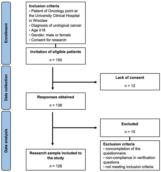 Patients visiting the Oncology Center at the University Clinical Hospital in Wroclaw, diagnosed with urological cancers, were recruited for this study, which was conducted between February and July 2022. After informed consent was obtained, participants were presented with the research questionnaire. Data collection was carried out through the Computer Assisted Web Interview technique, ensuring complete anonymity. A detailed outline of the participant selection process, as well as the inclusion and exclusion criteria, is provided in Figure 1.