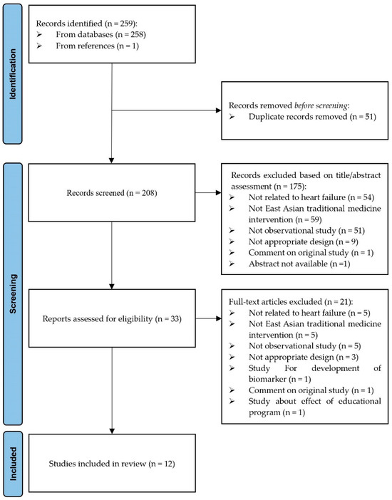 This review focused on peer-reviewed studies using RWD-based EATM interventions in patients with HF. The initial literature search was conducted in May 2022, and the final search, using the same strategy, was conducted in September 2023. The following databases were searched: MEDLINE via PubMed, EMBASE via Elsevier, Cochrane Central Register of Controlled Trials, Cumulative Index to Nursing and Allied Health Literature, and Allied and Complementary Medicine. The search strategies were discussed by clinical research experts and Korean medicine doctors, employing a combination of terms, including HF, RWD (“cohort” or “case-control” or “cross-sectional”), and EATM (“Chinese medicine” or “Kampo medicine” or “Korean medicine”). The search strategy incorporated various medical subject heading terms and synonyms, and detailed search formulas are provided in Supplementary Table S1.