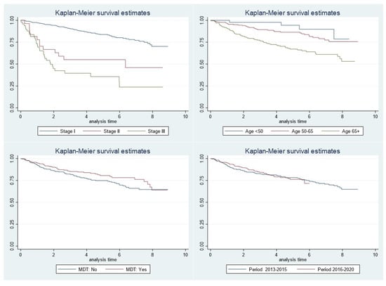 Reggio Emilia Cancer Registry, years 2013–2020. Kaplan–Meier curve of disease-free survival by stage, age, MDT, and period.